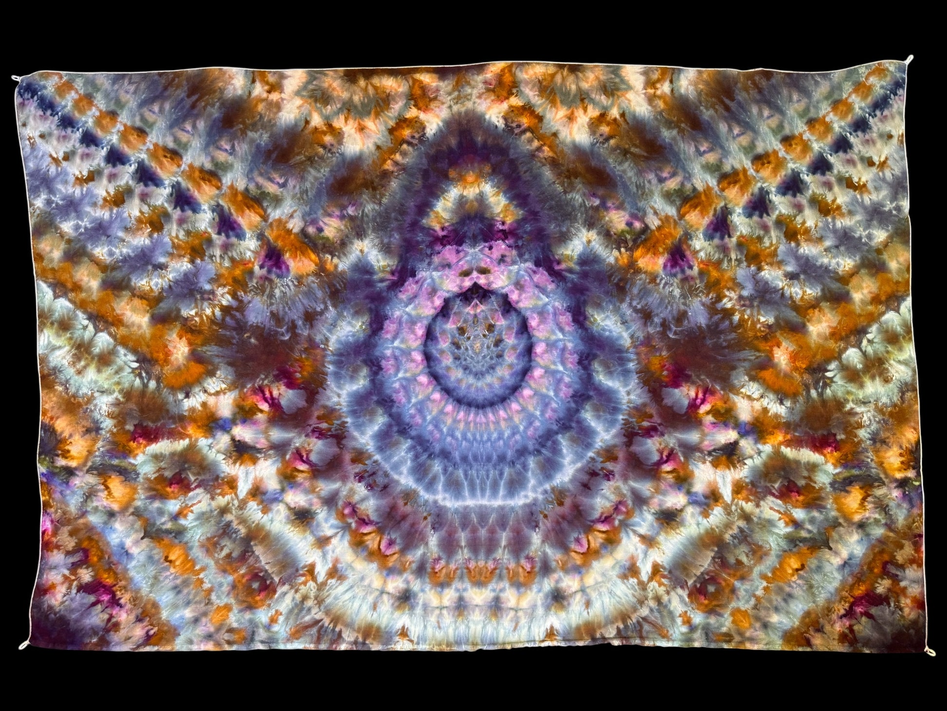 ice dyed small rayon tapestry. multicolor cosmic mandala design with cosmic rolls reaching outward. features corner hanging loops. 1/1