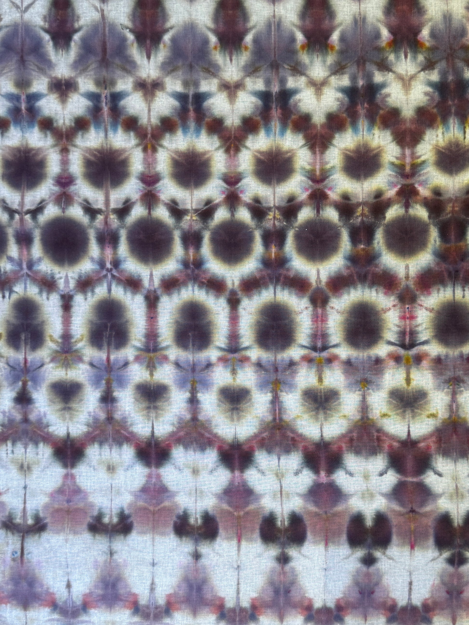 sekka shibori tied and ice dyed bandana in a custom blended color called “red tide” which has reds, pinks and purples. 1/1