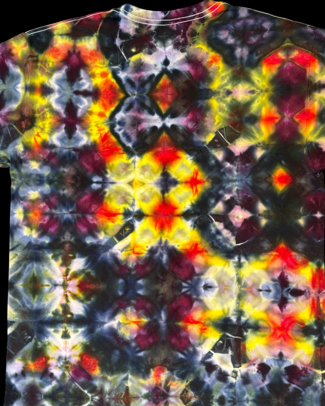 glitch folded tee, ice dyed with oranges, purples and black, splitting into new shades as it travels through the fabric. 1/1