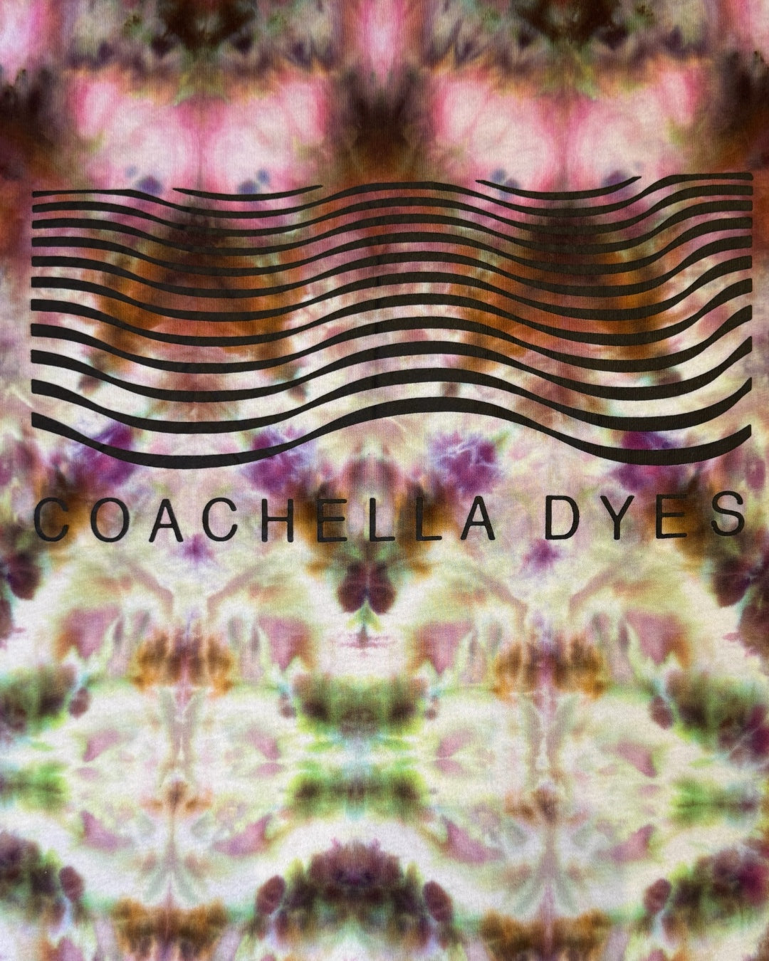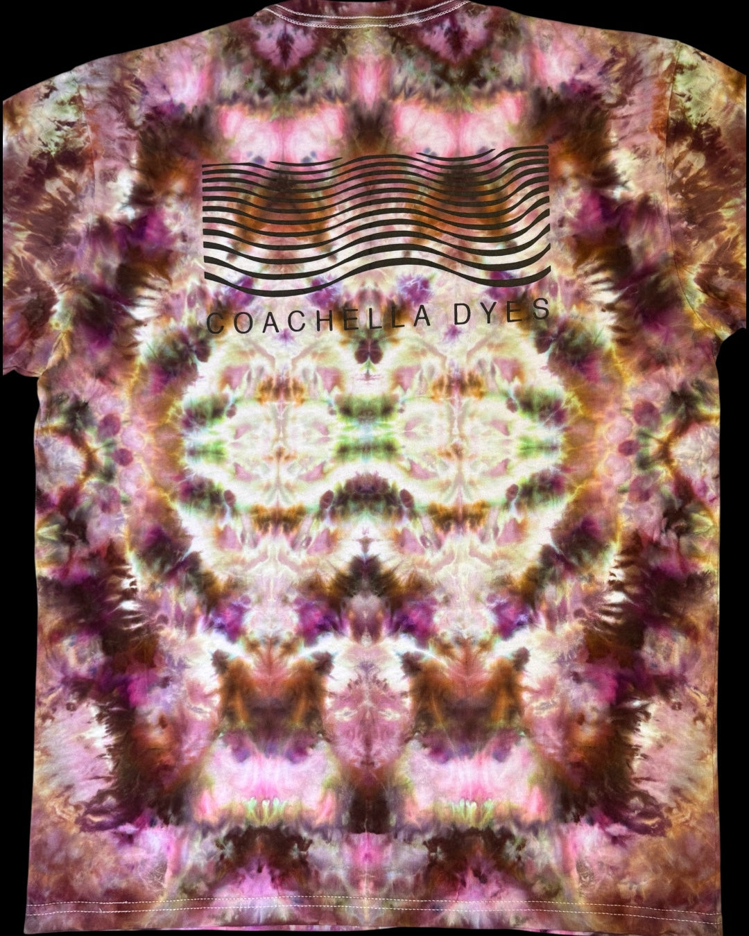 super soft tee with a trip style tie up, ice dyed in colors that split into bright pinks, purples and minty greens anchored in contrasting rust brown. features a coachella dyes logo on upper back. limited edition 1/1