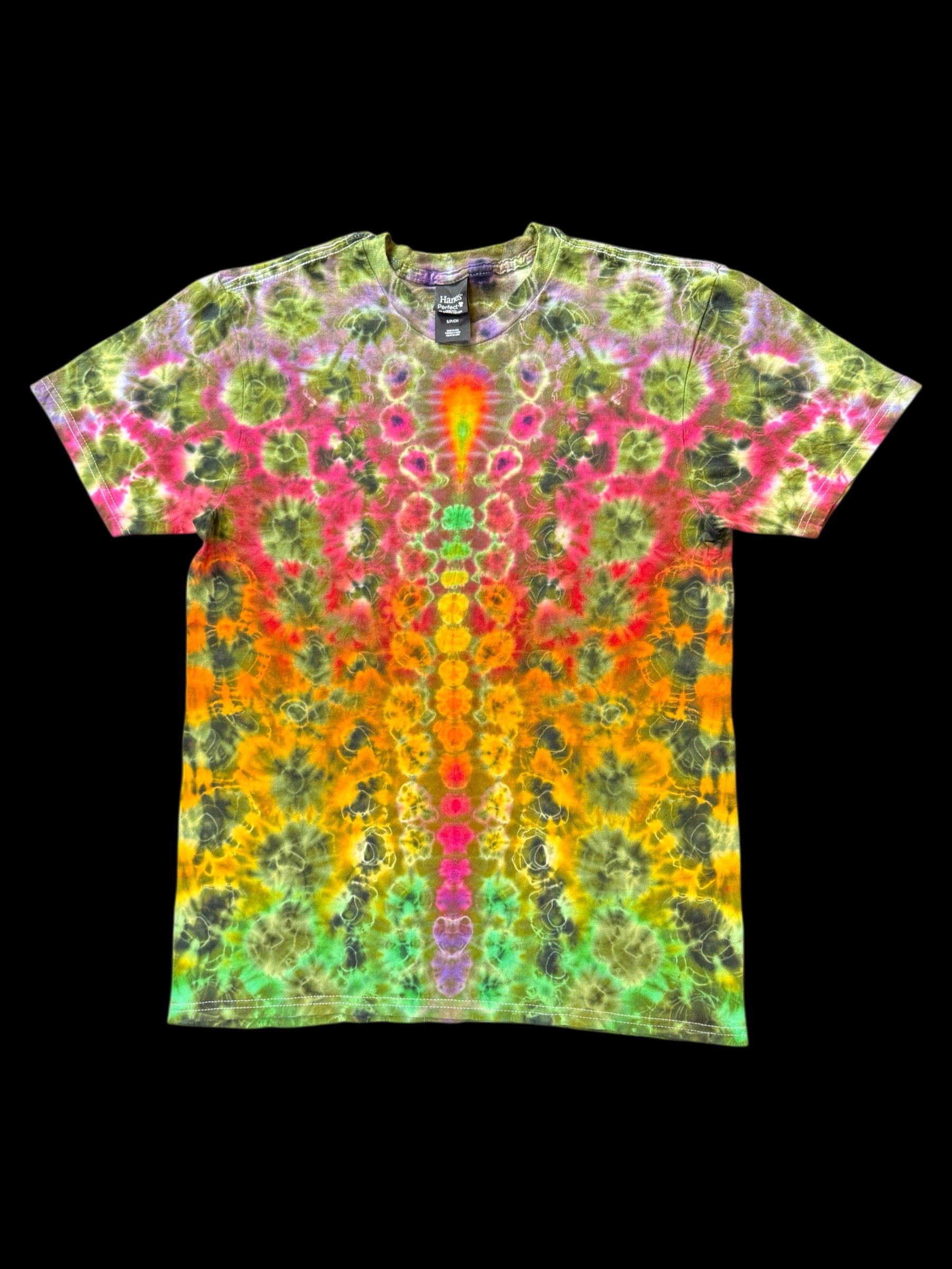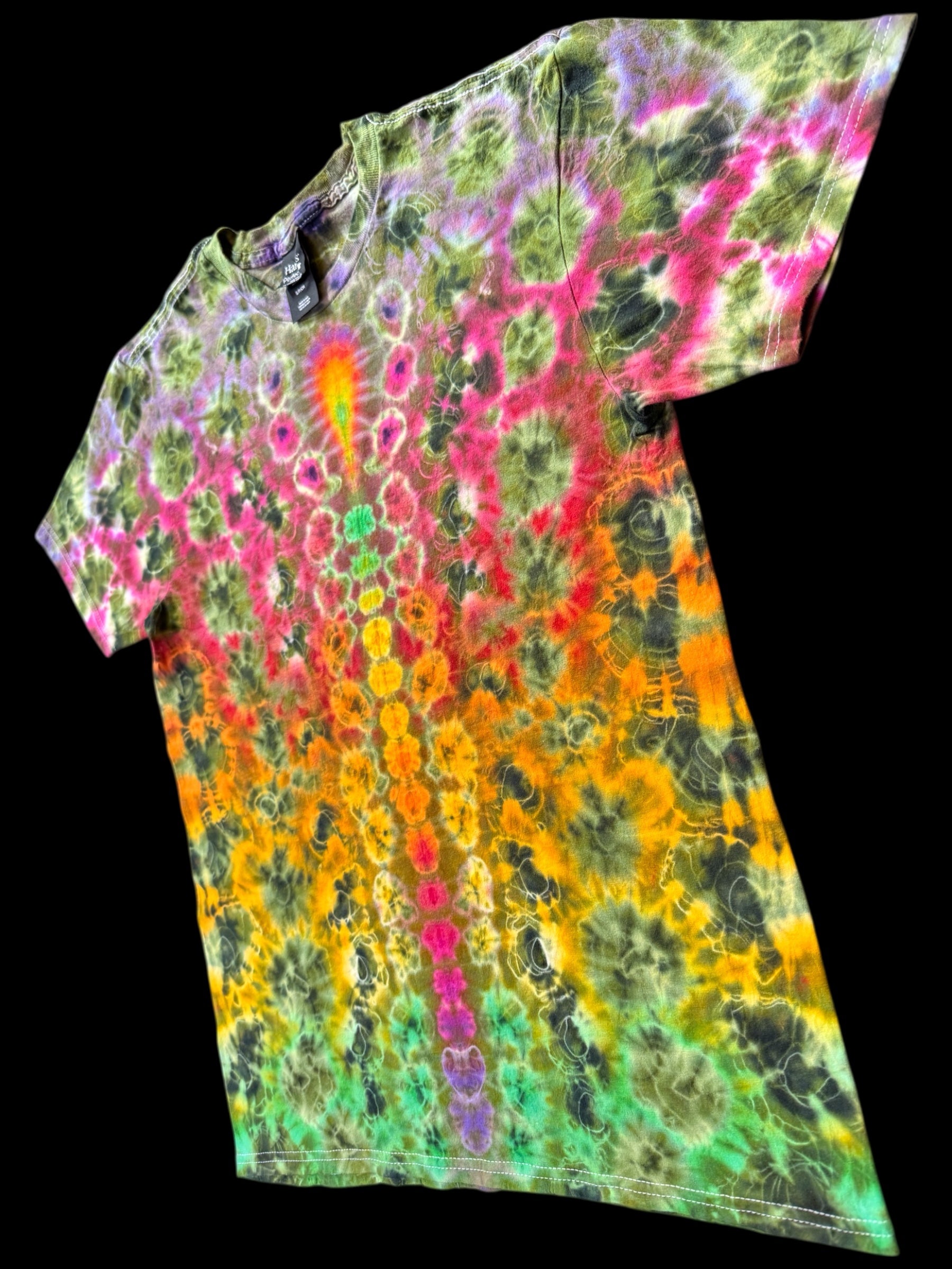 kenney style tie up with vibrant pinks, reds, orange, yellows and green, paired with a contrasting avocado green and black detailing. 1/1