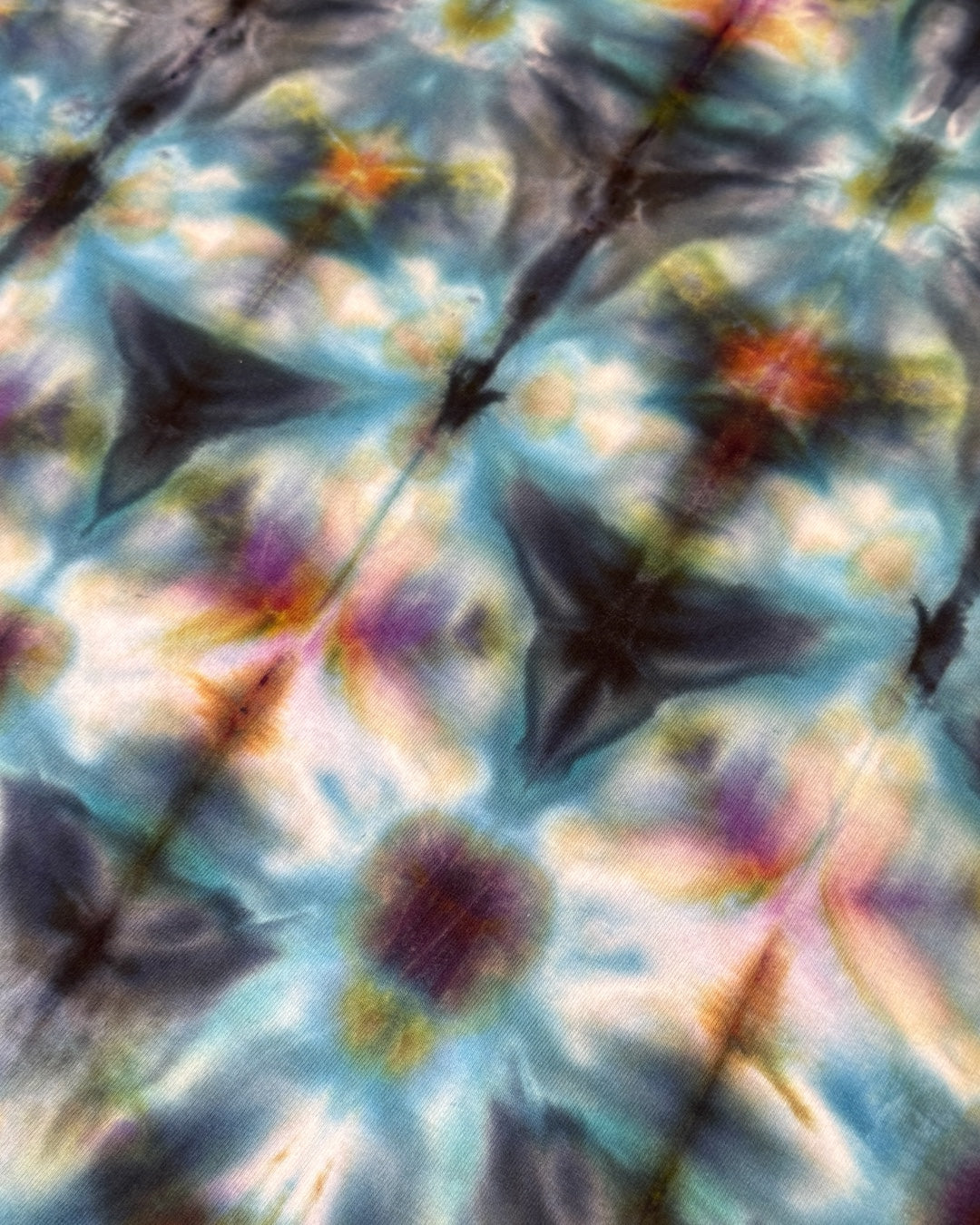 sekka shibori fold, ice dyed with avalon, alchemist, seaglass and raven, splitting into blues, greens, purples and black with pops of fuchsia and orange. 1/1