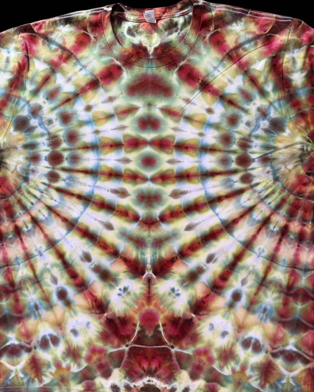 mirrored fan fold, ice dyed in blue gray and phoenix flame which split into soft yellows, earthy orange reds and grassy greens with pops of muted blue. a perfect color palette for fall. 1/1