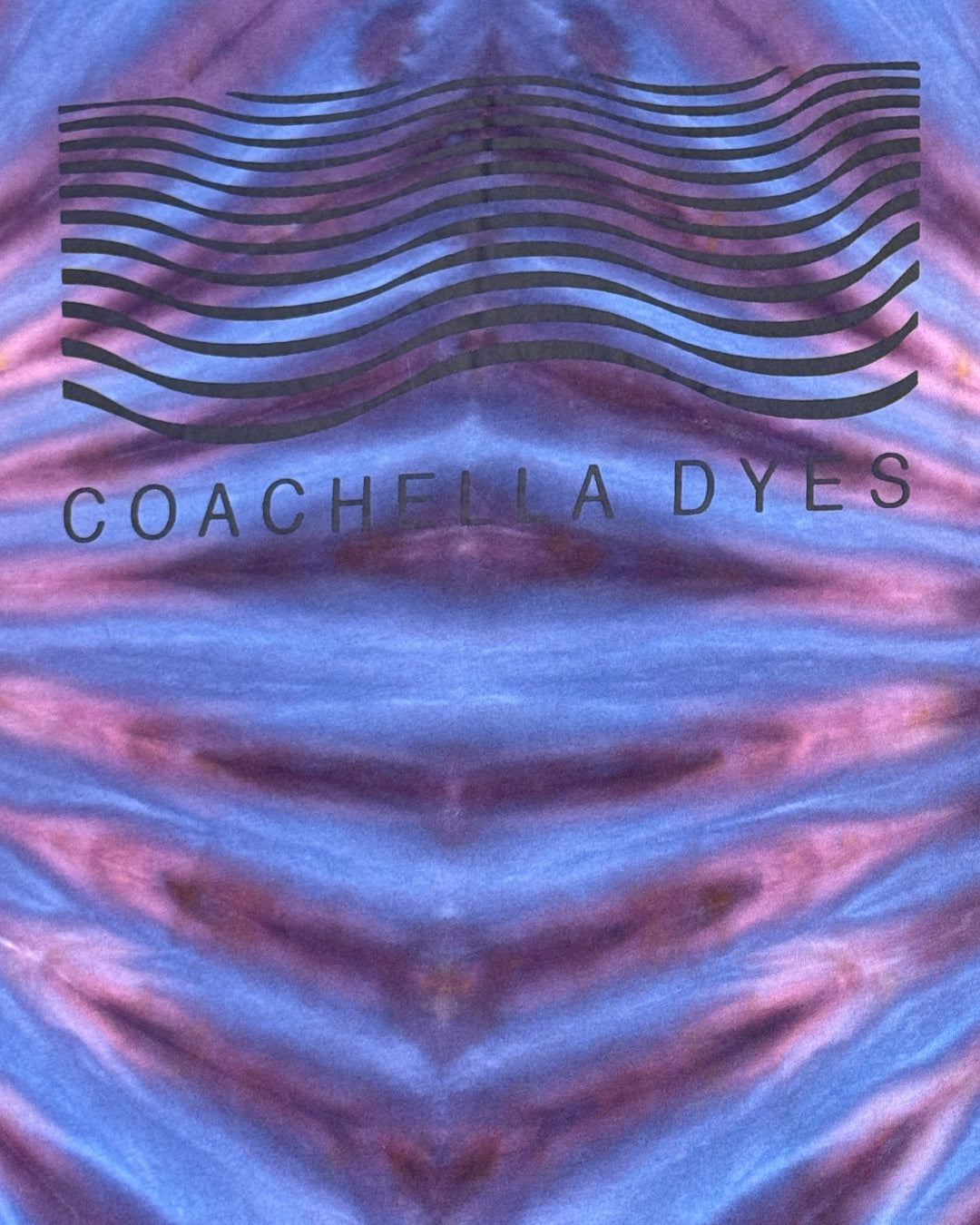 mirrored fan fold tie up, ice dyed with my own custom blend color ‘blue hour’ that splits into soft muted reds and vibrant periwinkle blues reminiscent of the last moments of light in the sky. super soft premium tee featuring a black coachella dyes logo on the upper back. 1/1