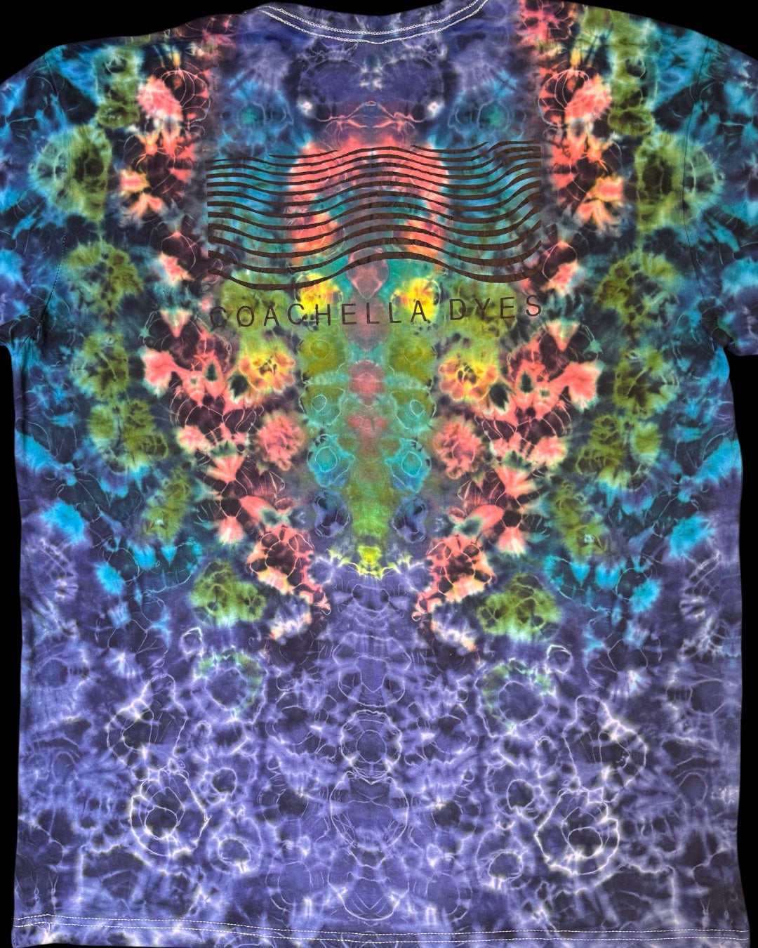 super soft tee with a kenney style tie up. liquid dyed with deep blues, turquoise, olive and grass green with contrasting citrus yellow and coral. features coachella dyes logo on back. limited edition. 1/1