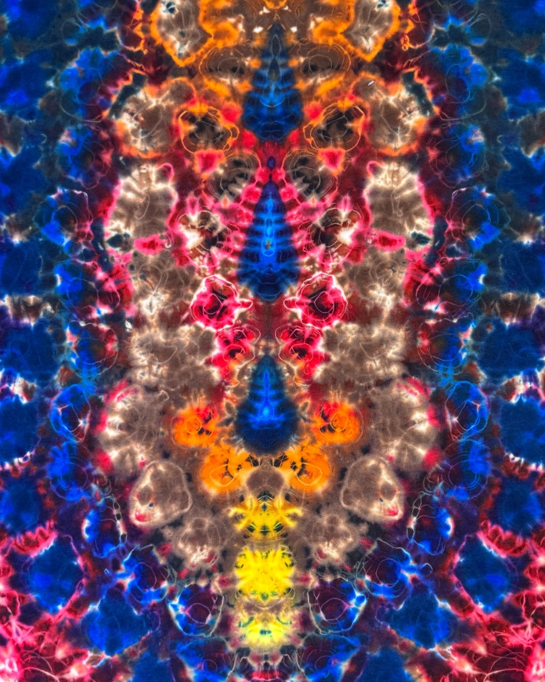 this tee is drippin’. the drips in the center surrounded with kenney style nubs. liquid dyed in vivid blues and contrasting fiery oranges, bright reds and yellows with some earthy browns. 1/1
