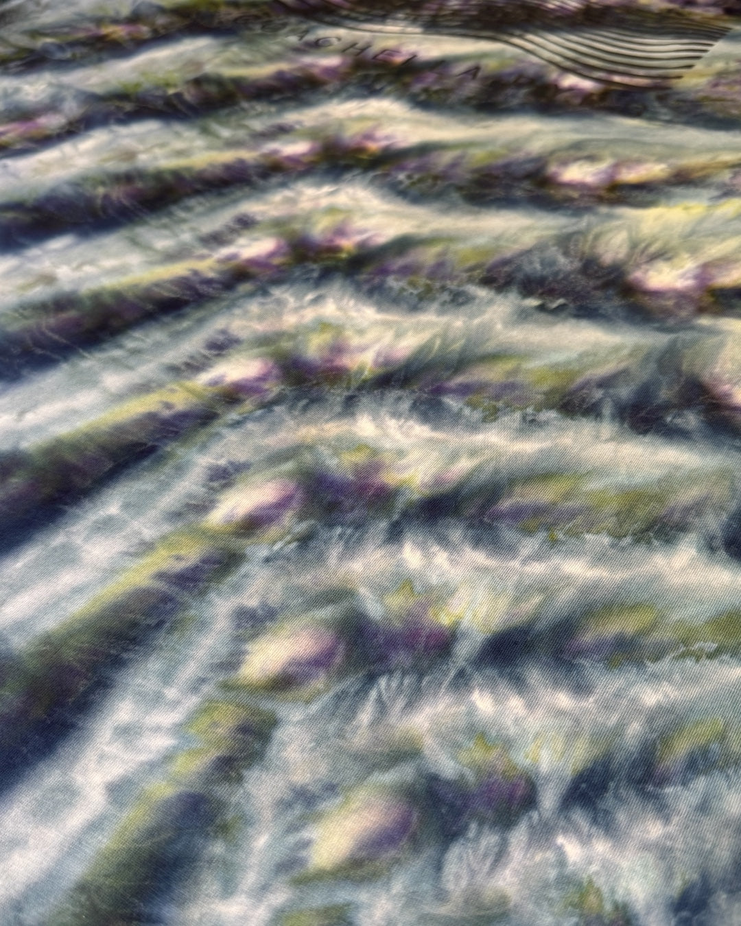 cosmic roll tie up, ice dyed with avalon that splits into muted greens and a range a blues and purples. super soft premium tee featuring a black coachella dyes logo on the upper back. 1/1