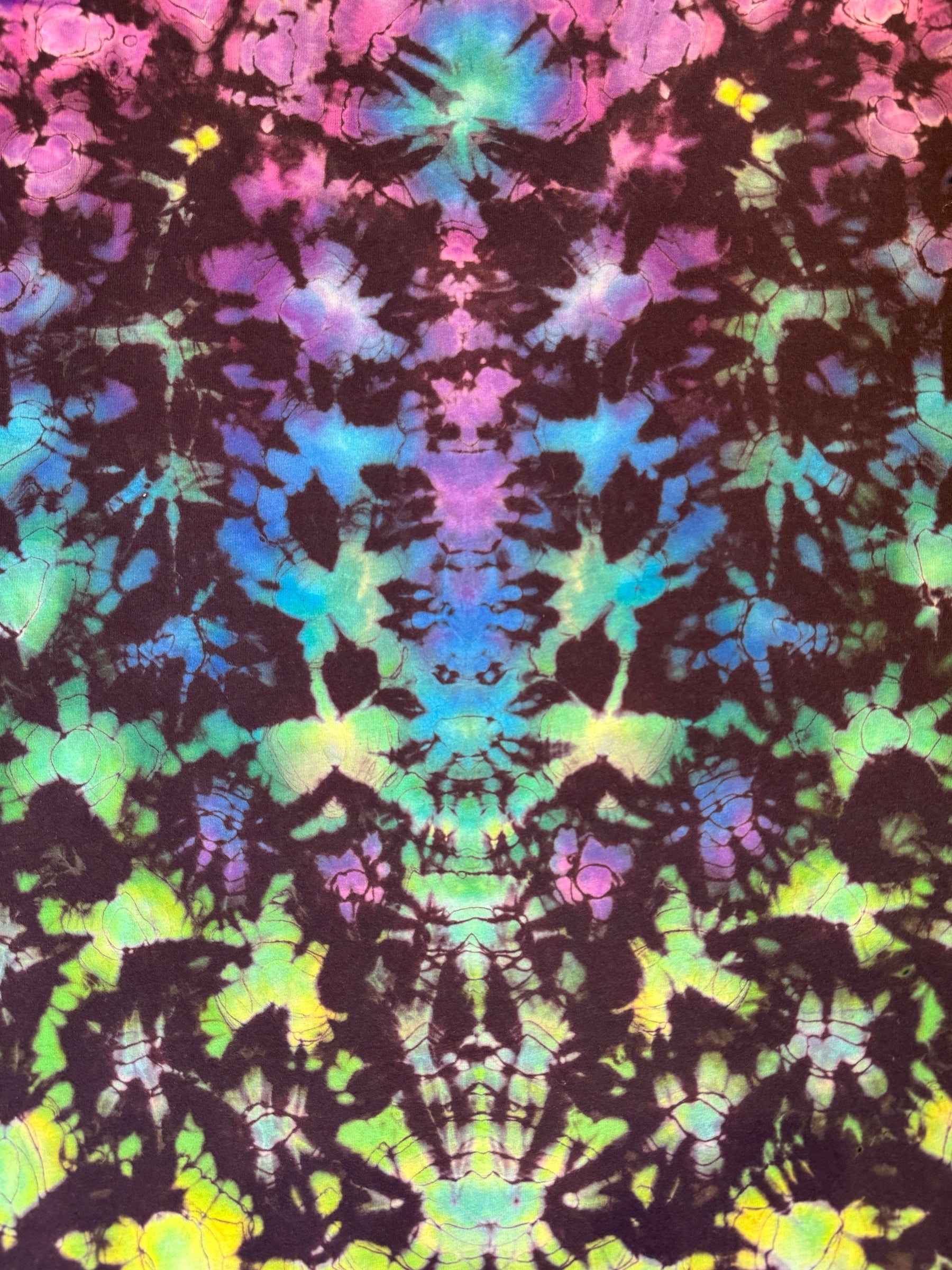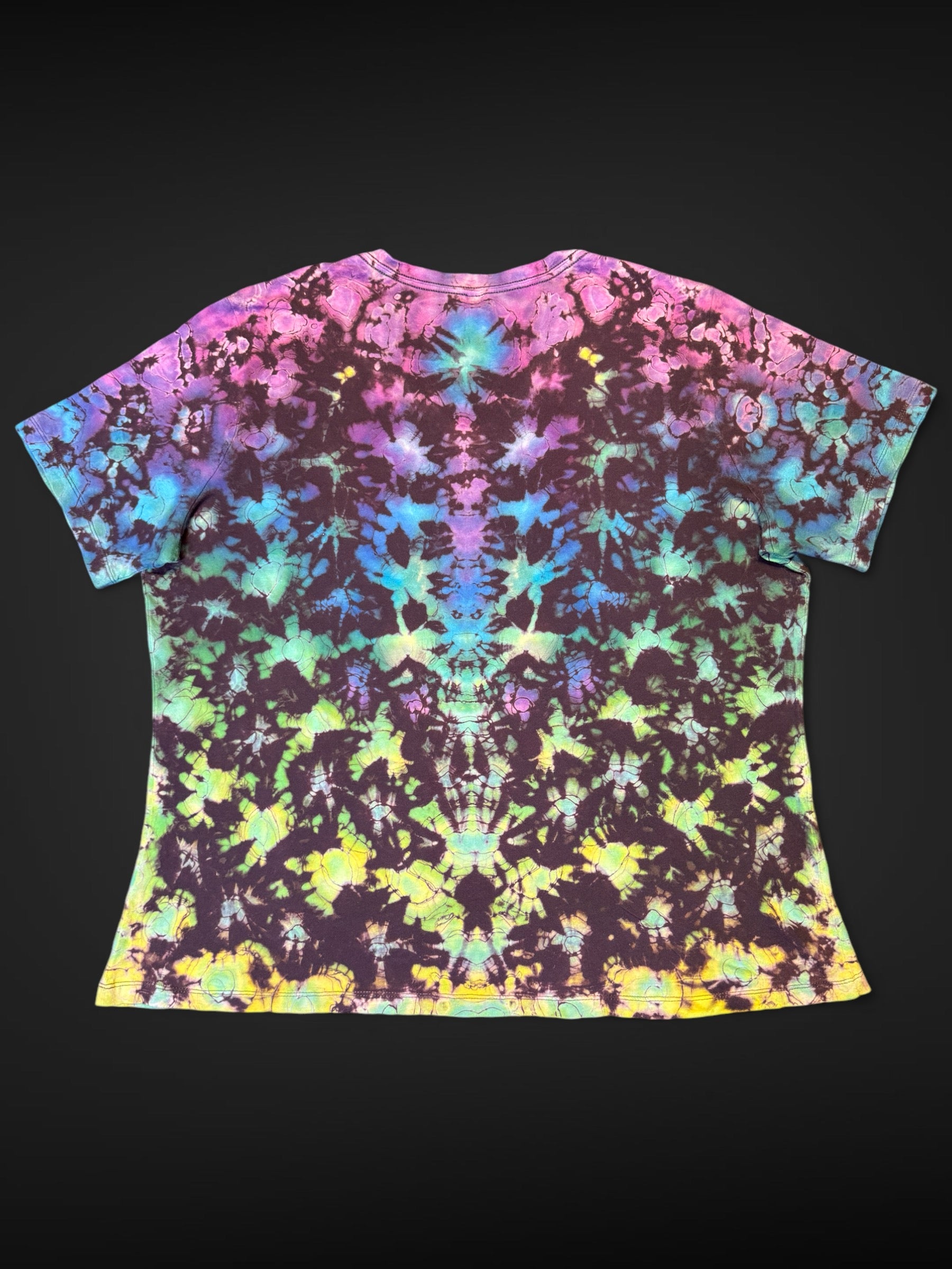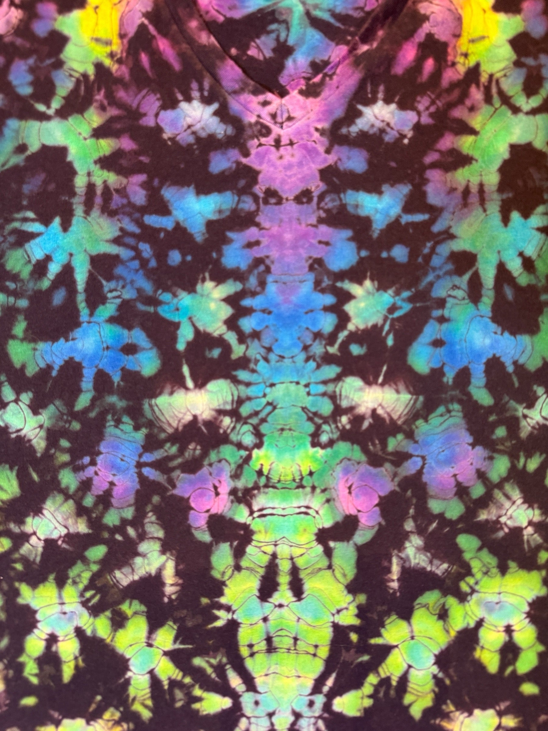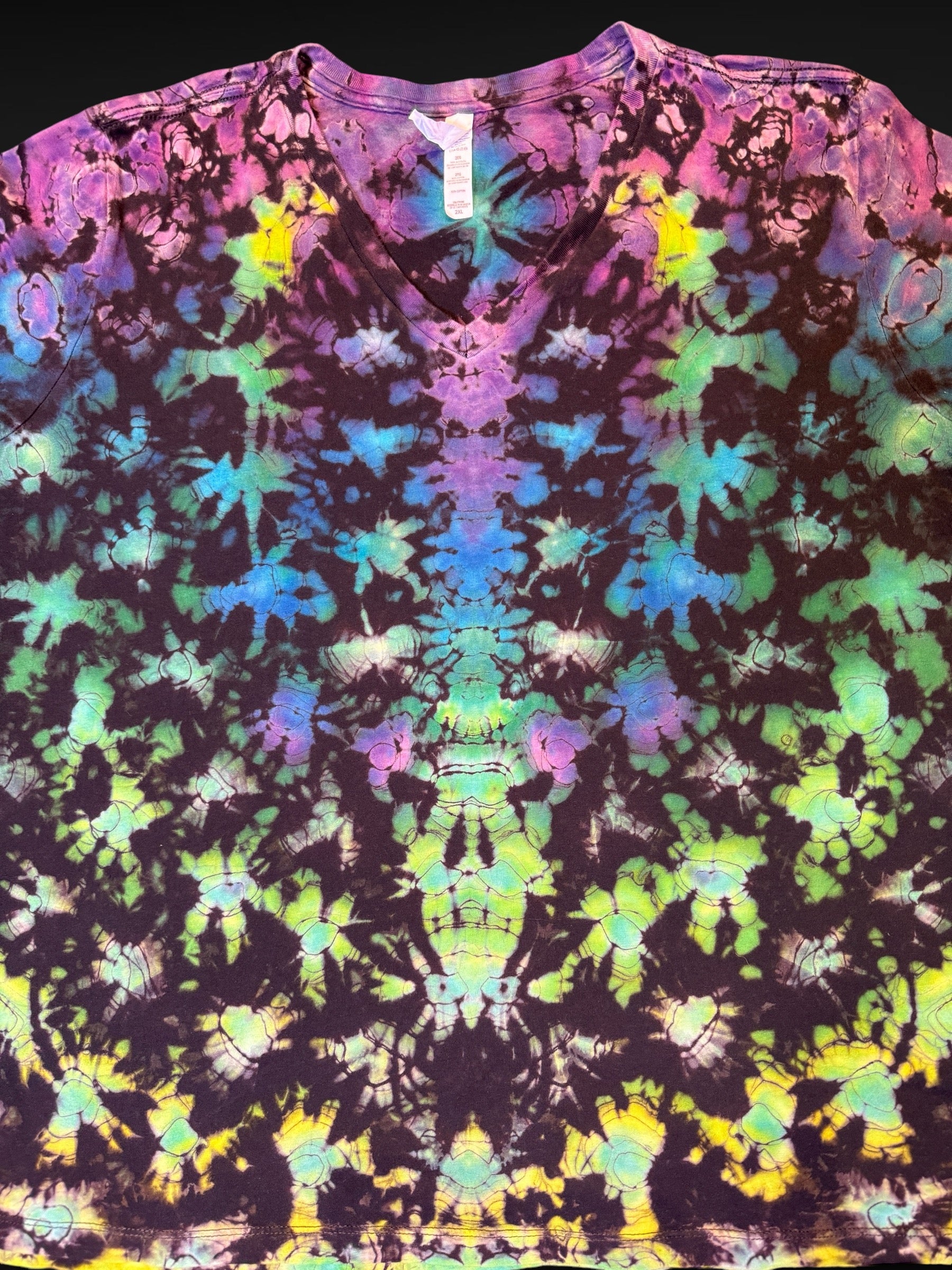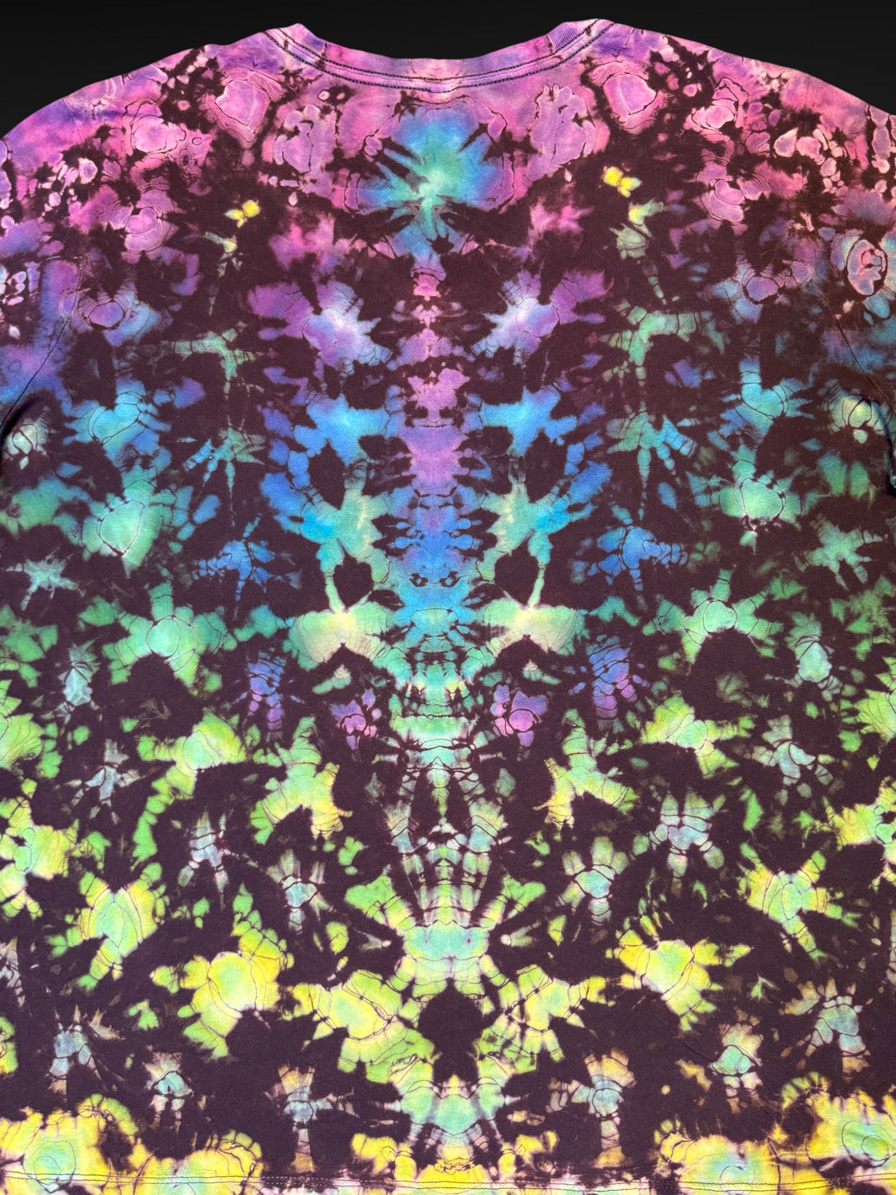 reverse dyed black tee in kenney style geodes with some greens, blues and purples. 1/1