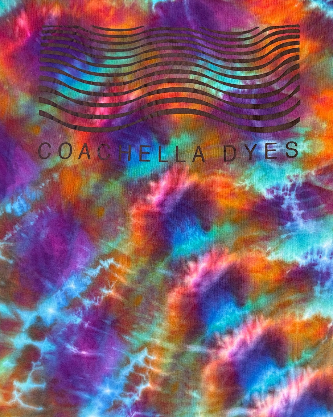 limited edition logo tee, tied in a cosmic roll and liquid dyed with rainbow colors. features a black coachella dyes logo on the upper back. 1/1