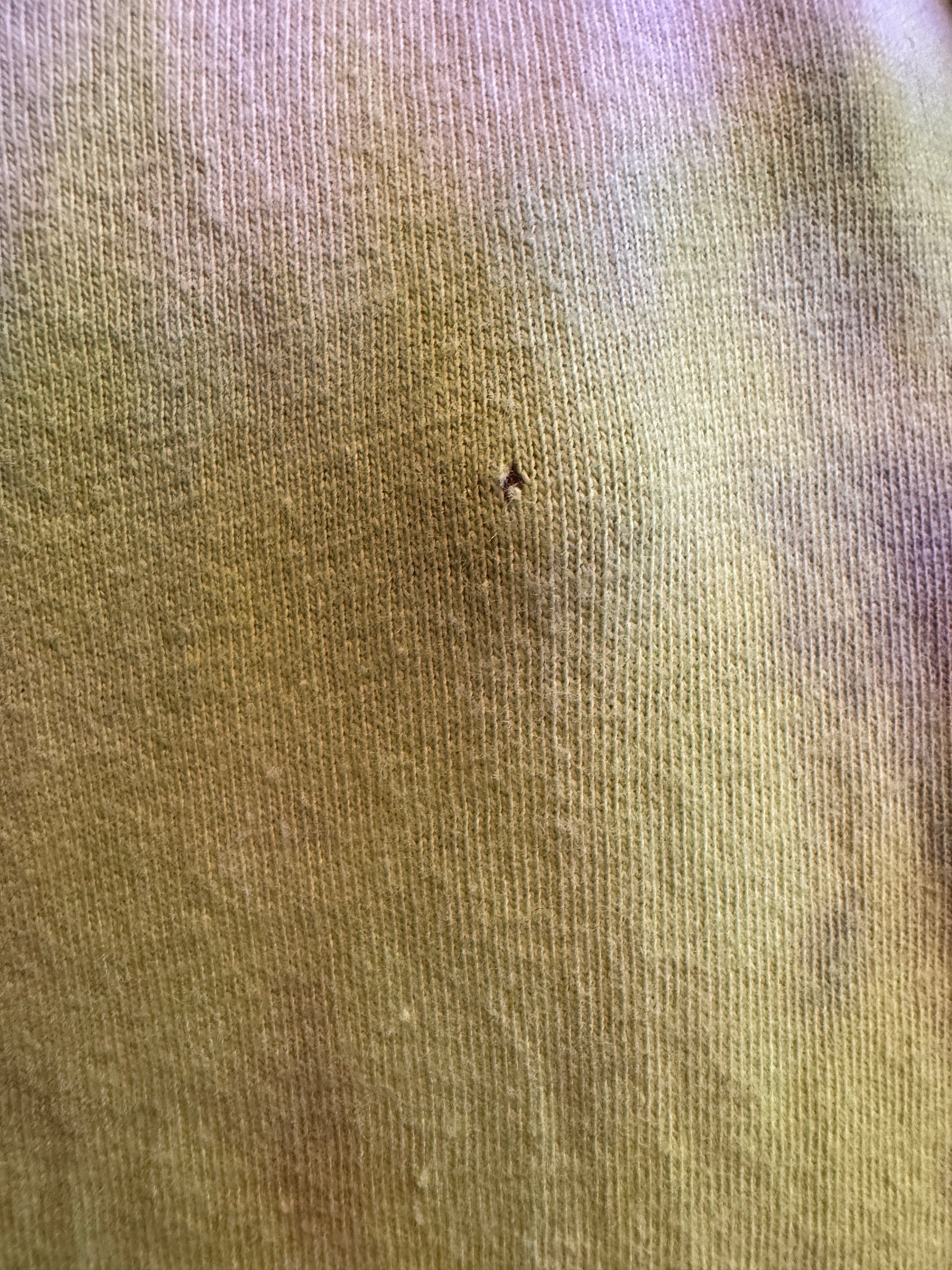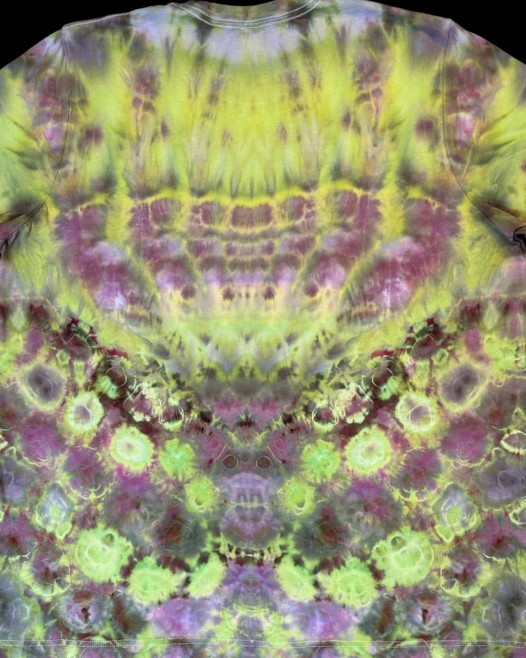 adding this one to the misfits section due to a tiny hole on the back side (see last photo). tied in a cosmic roll in the center with kenney style fill. ice dyed in a custom blended color, splitting into bright greens and dusty purples. 1/1